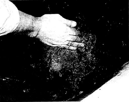 Retained mud can accelerate paint blistering and corrosion rates. Where the mud is not disturbed by ballast water movement, microbial corrosion of the type shown in photograph 8 can also occur. In the photograph, the hand is brushing aside the mud and water to reveal areas of freely corroding steel, which is indicative of microbial corrosion.