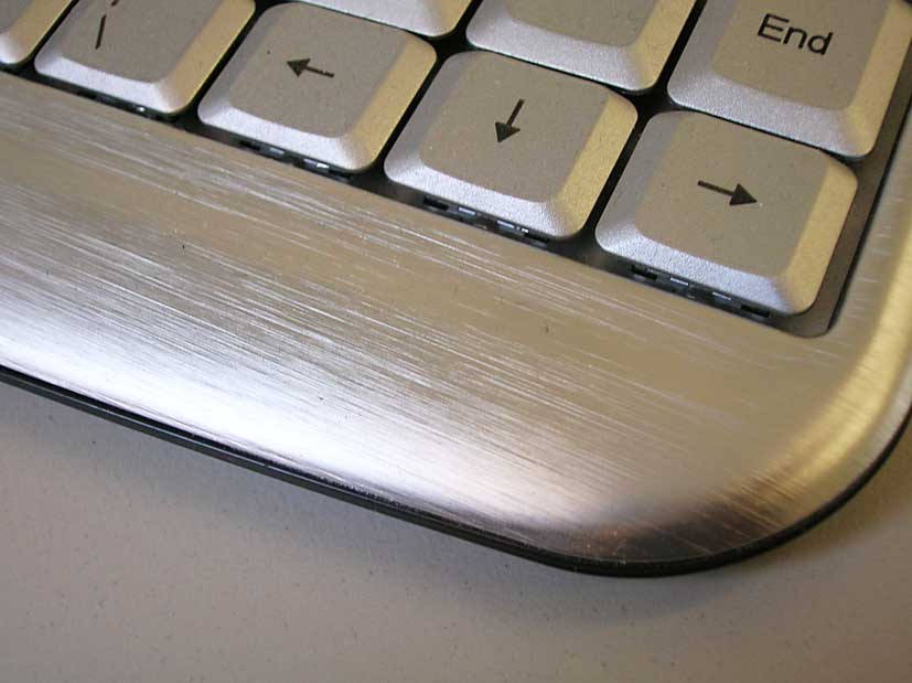 The most common surface modification to aluminium surfaces is anodising. There are three common types of anodising treatment and they are commonly known as types I, II, & III. Type I anodising is carried out in Chromic acid & is relatively uncommon due to environmental reasons but still persists in the aerospace industry. Types II & III anodising are carried out in sulphuric acid. Type II is the most common type for decorative finishes & as a pre-treatment prior to the application of organic coatings. The gold coloured component shown above has been sealed using a dye in the hot water sealing solution. The anodised keyboard shown below has been sealed without a dye in the sealing water.