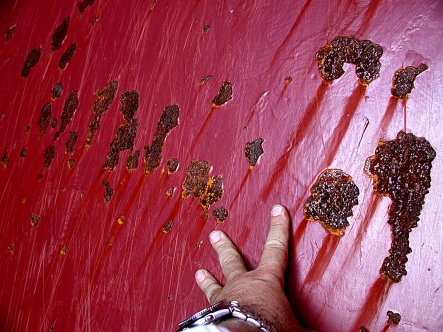 As the cargo settles, soft or weak paint can move with the cargo creating blisters and “sags” of the type shown in photographs 6 and 7 (scrape & sag and black tear/sag). The loose coating sag is removed by further settlement of the cargo, which in turn can cause the formation of another sag. Repeated “stick – slip” cycles of cargo settlement result in the tree shapes of photograph 2.
