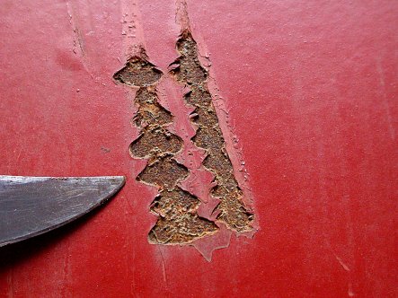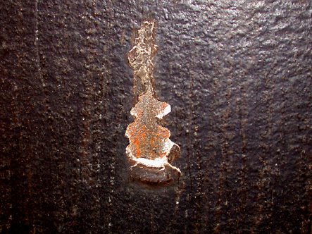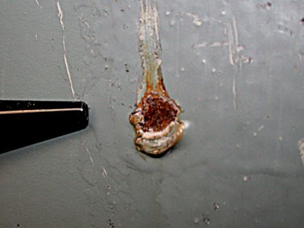 When examined visually, the damaged area may appear to be small, but when it is investigated with a penknife, it is often found that the paint is loose around the damage site. When this loose coating removed, the true extent of the corrosion and associated coating delamination becomes apparent. Photograph 5 (large disbond) shows two damage sites that were initially very similar with only tiny punctures visible in the paint. It can be seen that the corrosion under the coating and the loose paint extend several centimetres from the visible damage site.