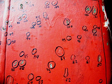 The type of coating failure produced by an active cargo is shown in photograph 1 (bulkhead). The defects have a characteristic “Christmas tree” pattern, as shown in photograph 2 (X trees) and typically have a high density of damages of between 60 and 250 defects per square metre, as shown in photographs 3 and 4 (many spots and big scrapes). The number of coating damages and sags varies depending upon the local conditions within the cargo hold. Factors such as coating type and the extent of cure, cargo type and shape and cargo corrosivity will all have an influence on the extent of damage. Other factors such as the method of loading the cargo, the sea states during the voyage and the quantity of water applied to or associated with the cargo are also important.